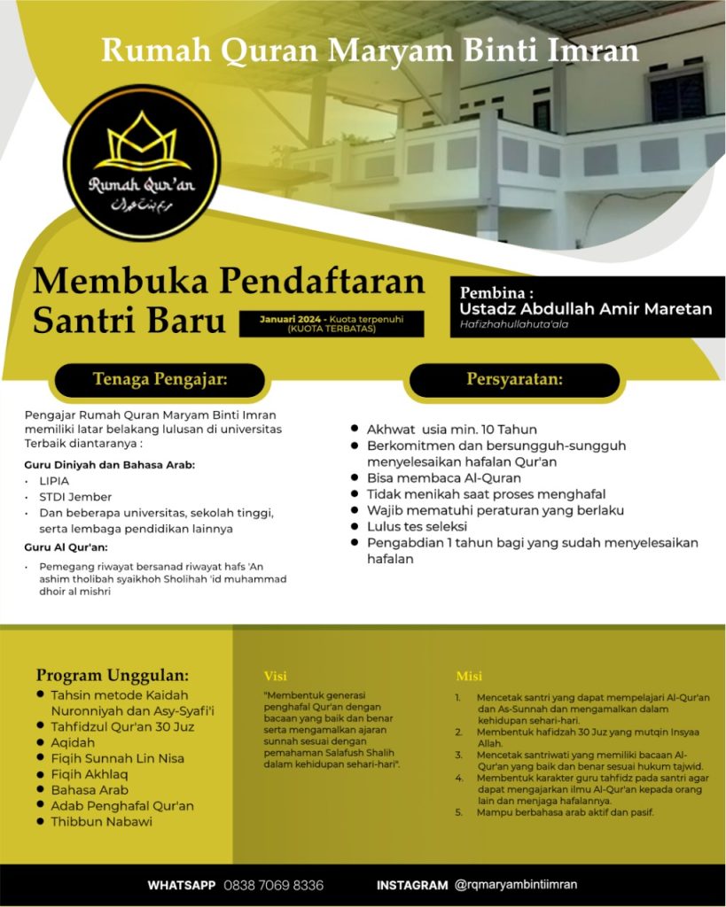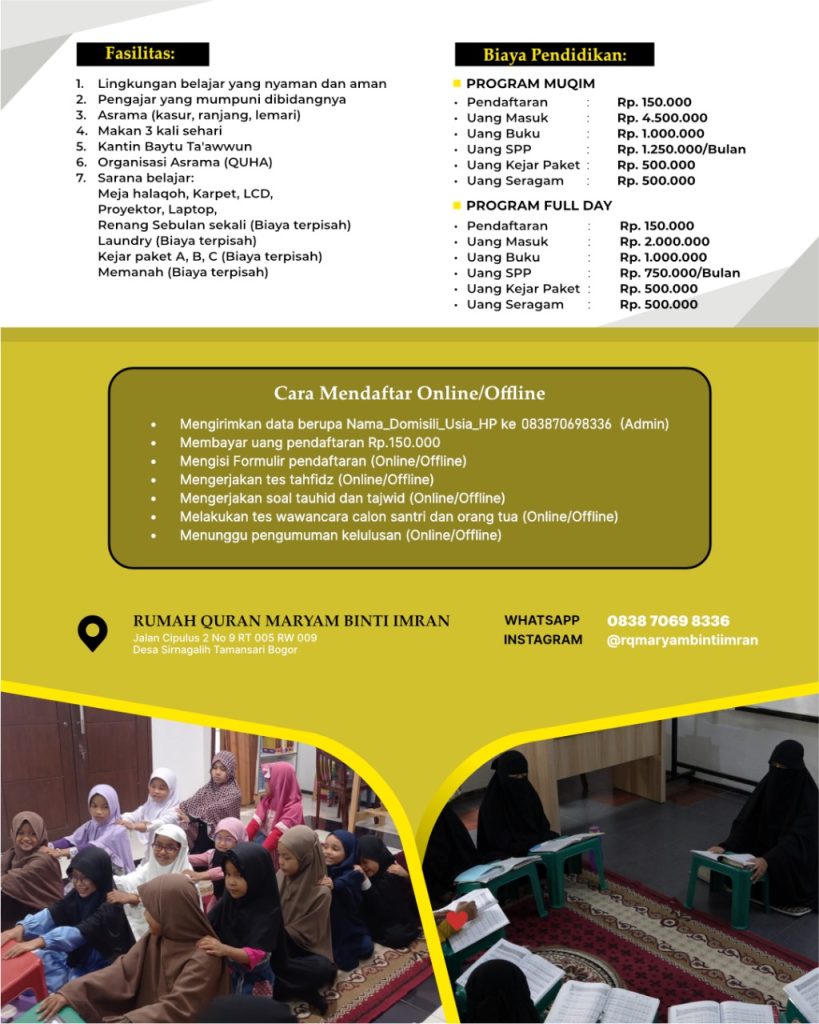 Alhamdulillah Rumah Quran Maryam Binti Imran Bogor di bawah naungan Yayasan Al-Kholil Bin Ahmad Al-Farohidi Kembali Membuka Pendaftaran Santri Baru